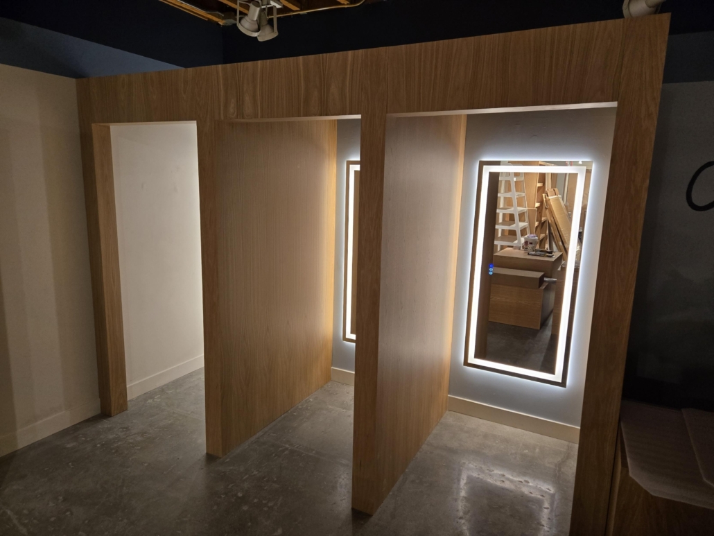 ICG helped cap off this location by completing some seamless white oak fitting rooms. These are accented well by the great choice in illuminated mirrors.